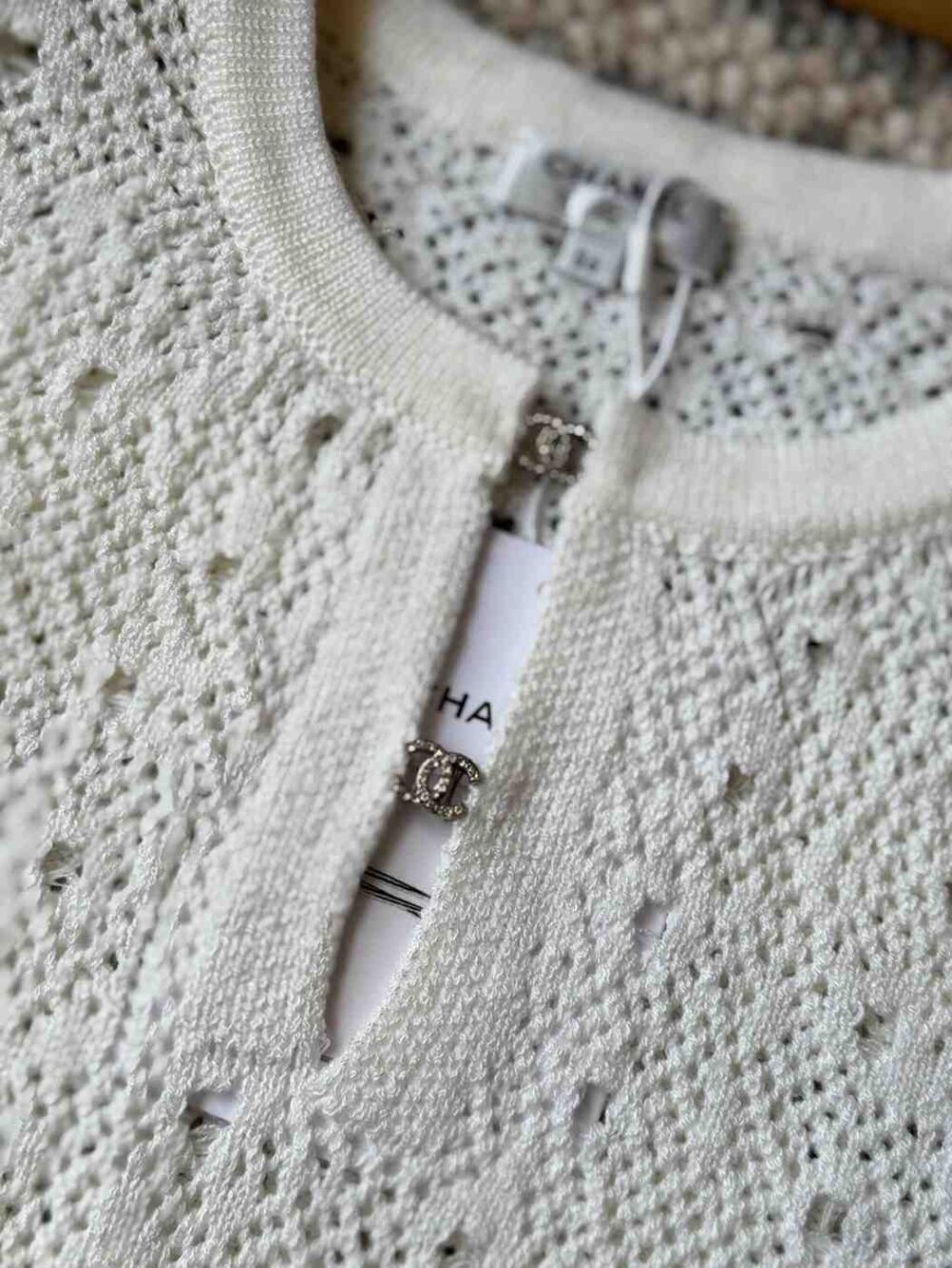 Product Short Description: Intricately designed cotton crochet knit sweater featuring the signature CC logo. A lightweight, elegant, and timeless piece from the Chanel-inspired collection.